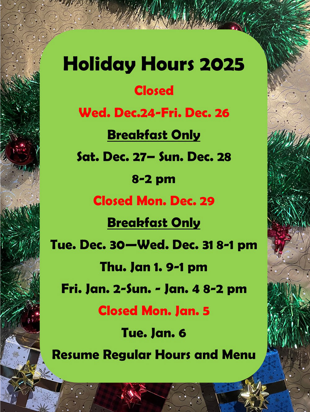Holiday Hours 2025